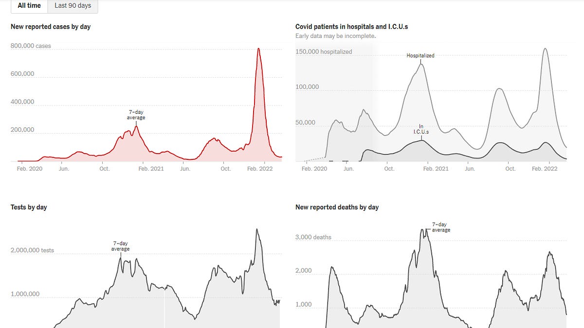 This week things are nearing historic lows on the COVID-19 front as we look at the data nationally. Nationwide, the 7-day average for cases is lower than it has been in a long time, but still 173% higher than the previous low set on 21Jun2021. Similarly, COVID hospitalizations are nearing the 2021 low (set 29Jun2021), but remain 15% higher. The US is still averaging 801 deaths per day. But this is a big improvement considering that the US averaged >1000 deaths per day from 21Aug2021 - 21Mar2022. ...