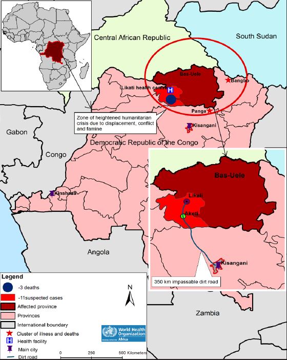 On 9 May, WHO was informed of a cluster of undiagnosed illness and deaths including haemorrhagic symptoms in Likati Health Zone, Bas Uele Province in the north of the Democratic Republic of the Congo (DRC), bordering Central African Republic.