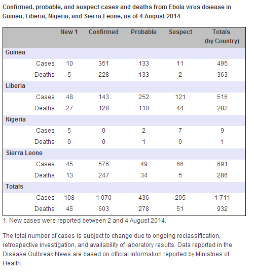 Re: Liberia - Ebola: 468 suspect/confirmed/prob cases, 255 deaths as of August 1, 2014 (WHO)