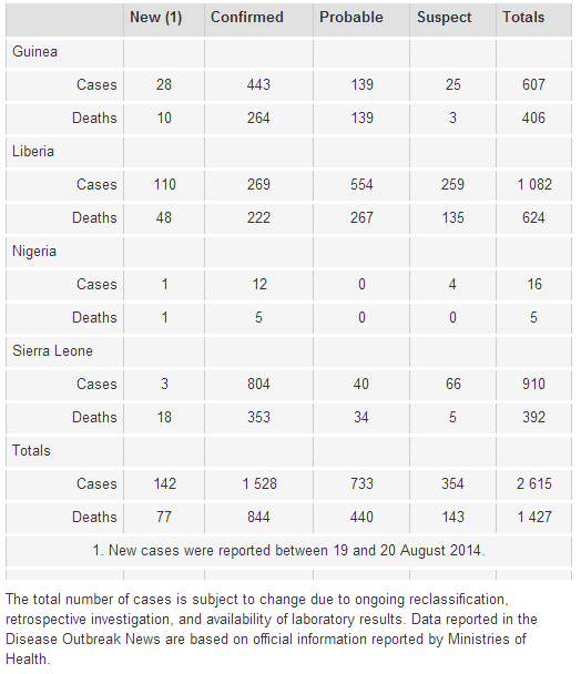 Between 19 and 20 August 2014, a total of 142 new cases of Ebola virus disease (laboratory-confirmed, probable, and suspect cases) as well as 77 deaths were reported from Guinea, Liberia, Nigeria, and Sierra Leone.