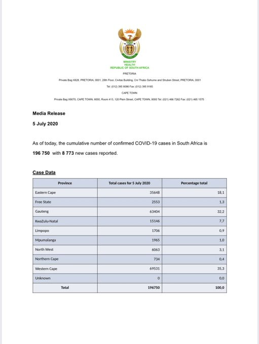 As of Saturday, 4 July 2020, the cumulative number of confirmed Covid-19 cases in South Africa is 187 977, with the number of deaths now at 3 026, Health Minister Zweli Mkhize announced in a statement.
