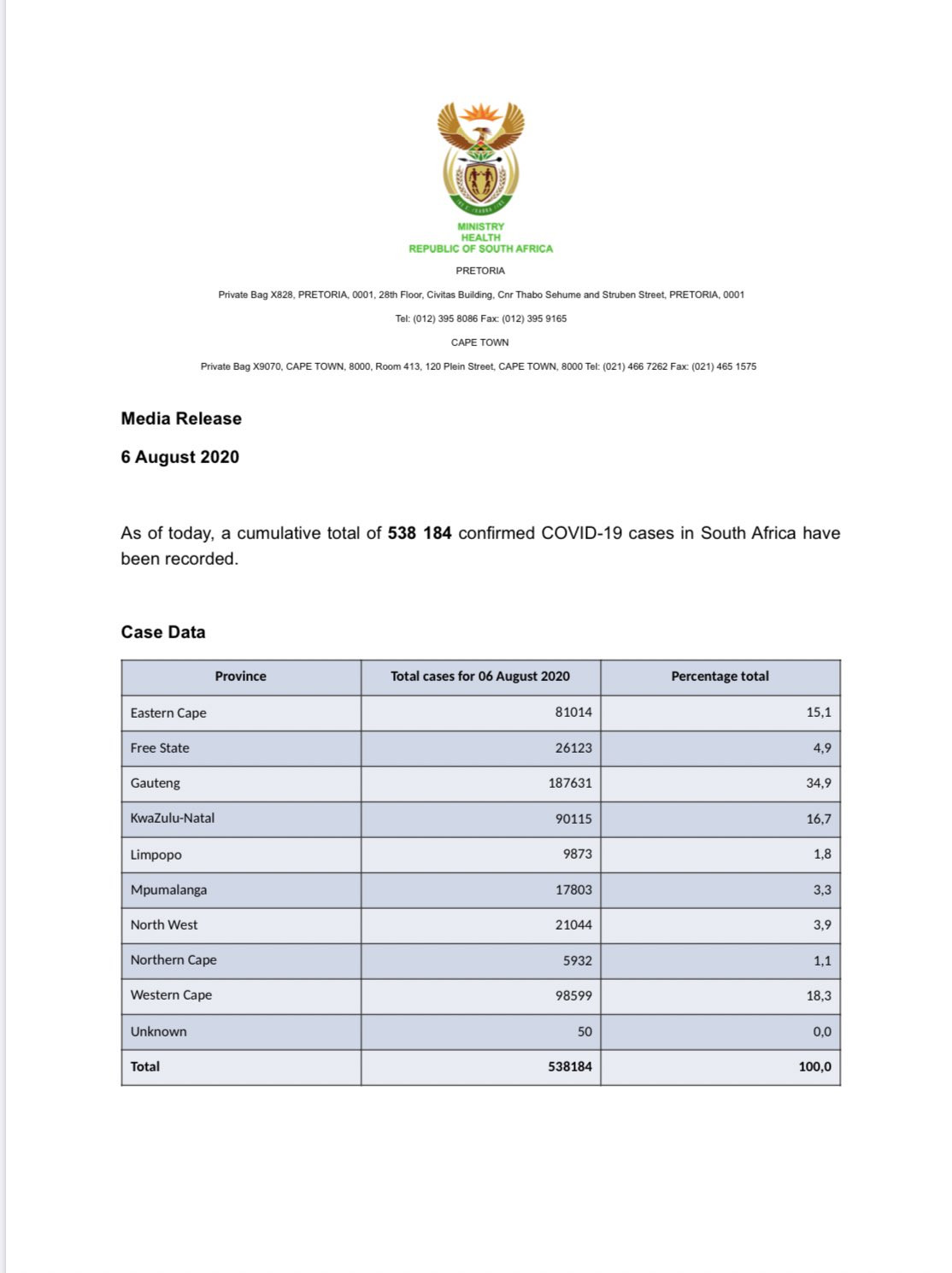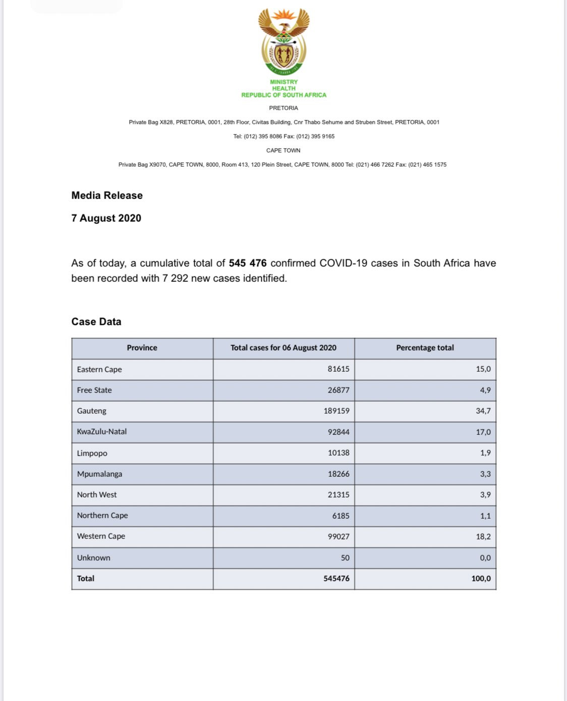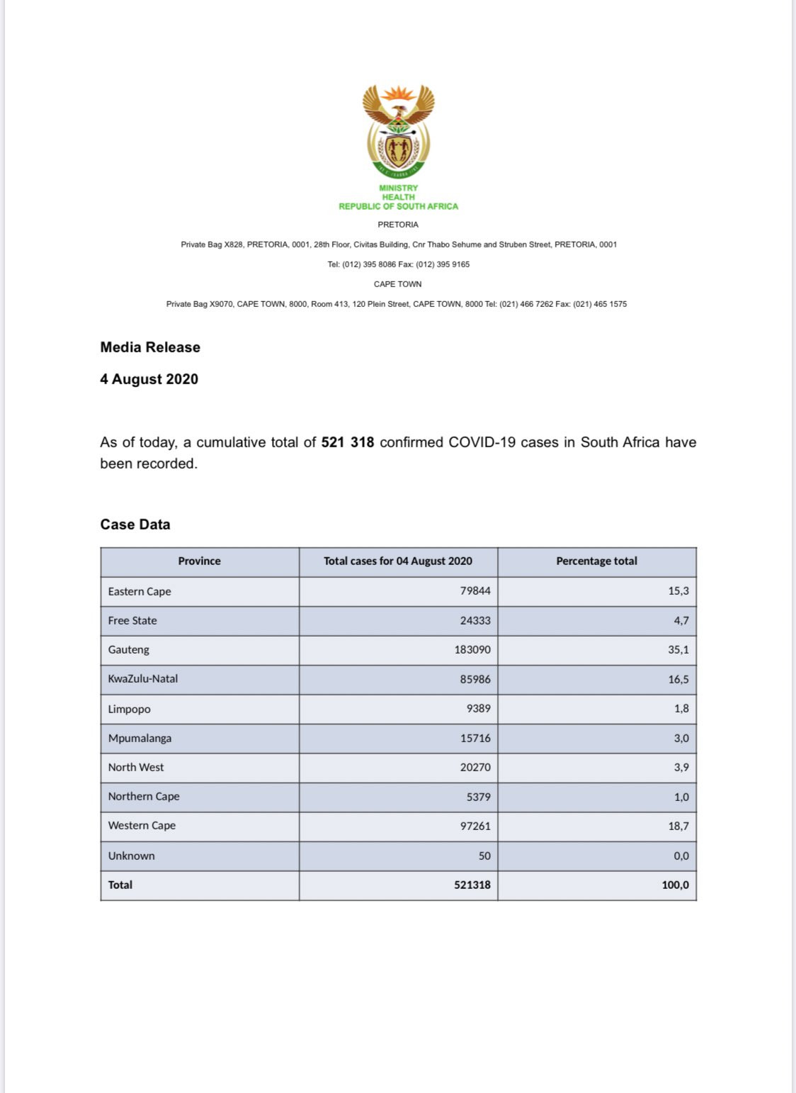 As of today, a cumulative total of? 511 485 confirmed COVID-19 cases in South Africa have been recorded with 8195 new cases identified. Case Data Province Total cases for 2 Aug 2020 Percentage total Eastern Cape 79 410 15,5 Free State 23 099 4,5 Gauteng 180 532 35,3 KwaZulu-Natal 82 300 16,1 Lim ...