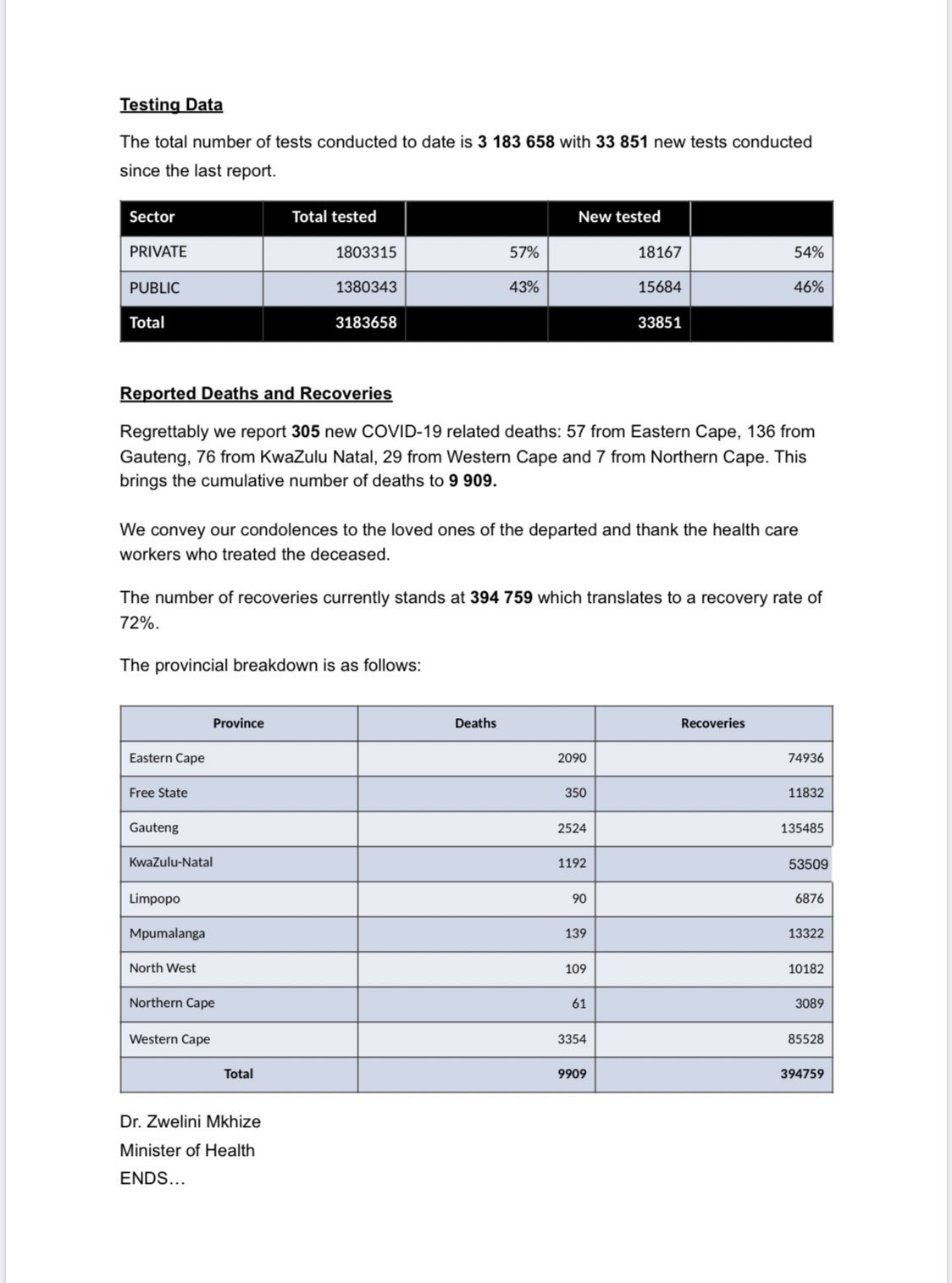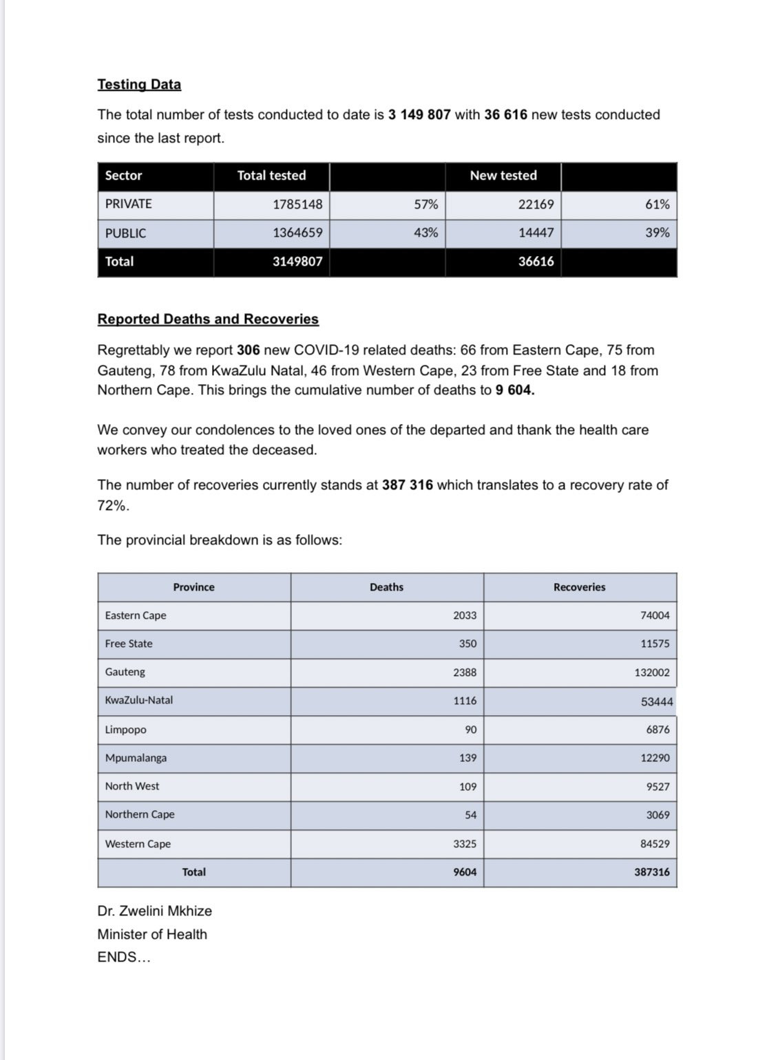Dr. Zwelini MkhizeProvince Deaths Recoveries Eastern Cape 2286 77550 Free State 414 13478 Gauteng 2653 150082 KwaZulu-Natal 1450 56758 Limpopo 127 8207 Mpumalanga 149 16416 North West 150 12245 Northern Cape 68 3391 Western Cape 3454 87998 Total 10751 426125