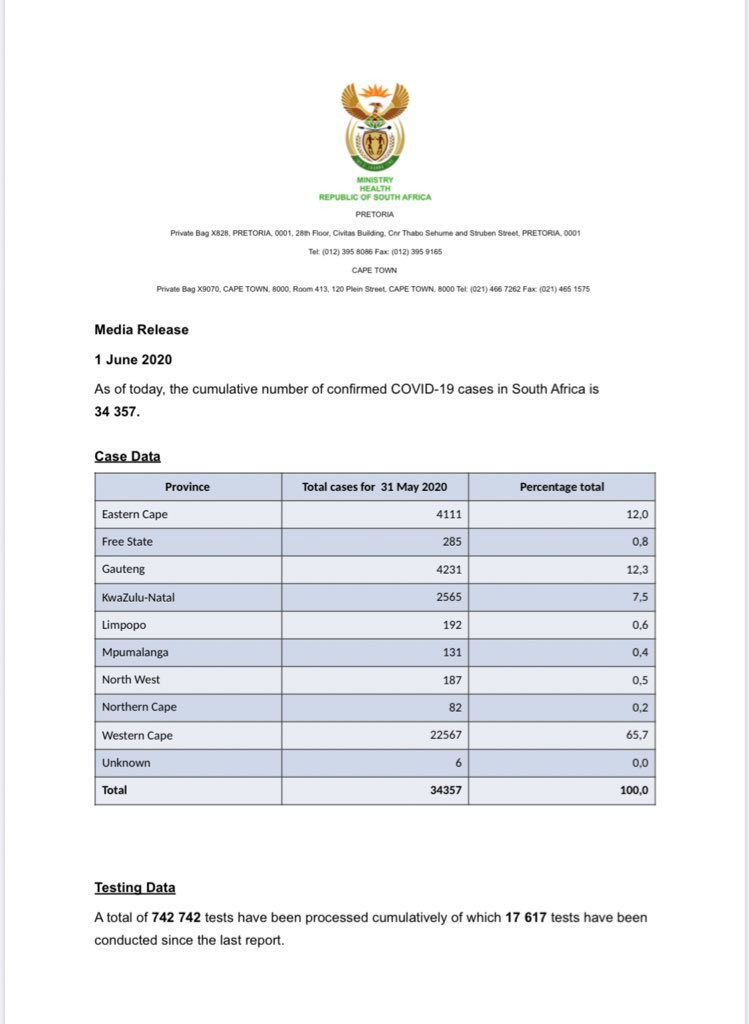 44 more Covid-19 related deaths: 25 in the Western Cape, 6 in KZN, 7 in Gauteng and 6 in the Eastern Cape. This brings the total national deaths to 952