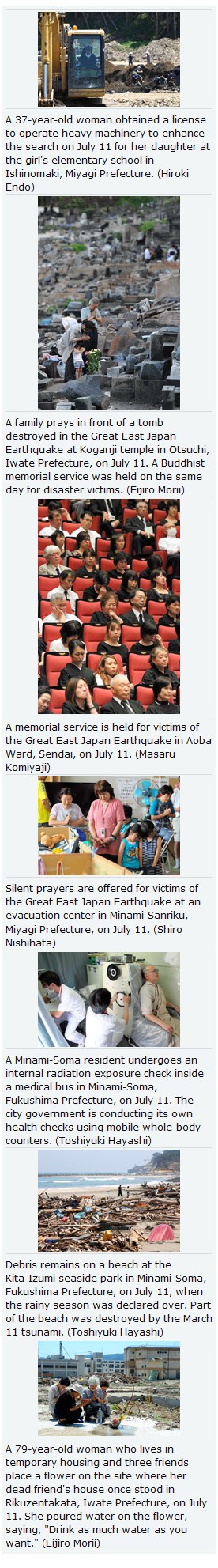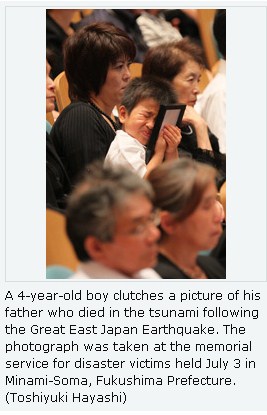 Nearly four months after the Great East Japan Earthquake, poignant scenes such as one of a 4-year-old boy embracing a framed picture of his deceased father touched hearts at a memorial service for victims on July 3 in Minami-Soma, Fukushima Prefecture......
