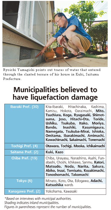 Damage to homes from soil liquefaction caused by the Great East Japan Earthquake was not limited to the three worst-hit prefectures in the Tohoku region, a Yomiuri Shimbun survey has found, but also spreads across six prefectures in the Kanto region.......