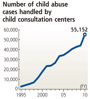 Japan's welfare ministry says the country's child welfare centers handled a record 55,152 cases of child abuse in fiscal 2010, which ended in March....