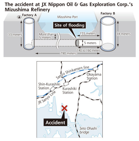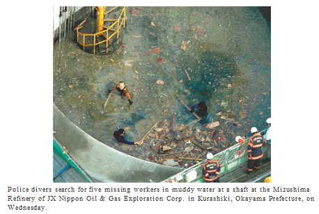 OKAYAMA--Five workers went missing at the Mizushima Refinery of JX Nippon Oil & Gas Exploration Corp. in Kurashiki, Okayama Prefecture, after a tunnel they were digging flooded with seawater Tuesday afternoon.