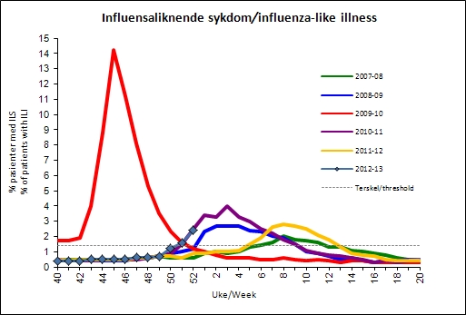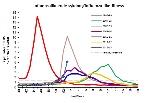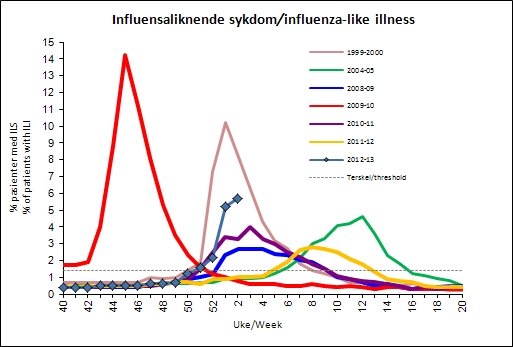 In the first week in January 2013 was 5.1% of those who went to the doctor diagnosis of "influenza like illness" (ILI) (Figure 1 and Table 2). Activity is high in all regions, with slightly lower rates in the North Region. Figures include data up to and including Thursday 3 January. Reports from hospitals in eastern suggests a decreasing stress in the days after 3 January, but it is uncertain whether this will be reflected in flu activity. There will be local variations in how much flu is circulating, and the time when the top is seen. For the country as a whole, we continue to expect increased activity.