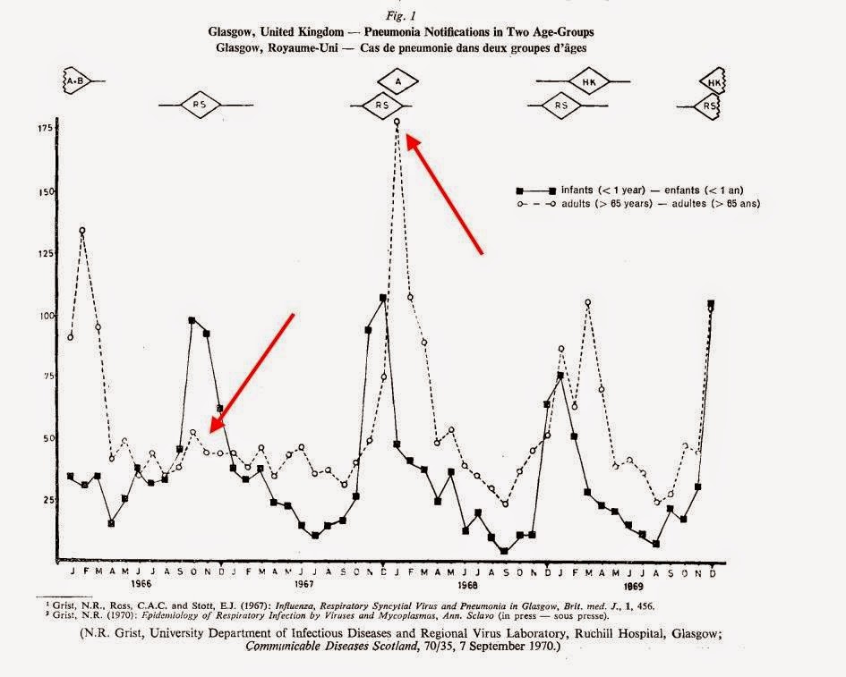 Si tratta di un articolo pubblicato sul Weekly Epidemiological Journal del 1970 che dimostra come eccezionalmente nell' inverno 1966/67 a Glasgow, in Scozia, non abbia circolato il virus influenzale, mentre era presente l' RSV. Come si vede dalla figura, in quell' anno non si è verificato il solito picco di polmoniti tra gli anziani, mentre è presente quello tra i bambini più piccoli. Le cose sono andate in modo decisamente diverso nell' inverno successivo, in cui si è ripresentato il virus influenzale.