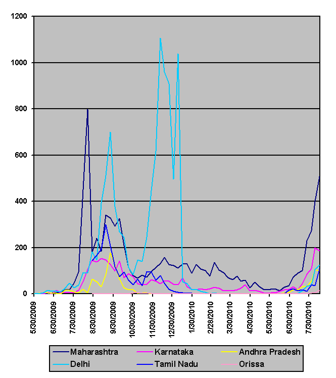 The Consolidated Status update from India has not yet been issued for this week. When it is, I will revise this report with updates. However, since the most active pandemic outbreak right now is occurring in India, I feel it necessary to go forward with what information is available. During the week from July 26th to Aug 1st at least 541 people tested positive for H1N1. Nationally, at least 57 fatalities were registered bringing the official total to 1,763 (my current total is 1,796). An additional 5 media reported fatalities from Maharashtra are awaiting confirmation. Little or no media information came from Tamil Nadu or Kerala this week. This is the most fatalities in a given week since January. 38 fatalities were recorded in Maharashtra. The largest single week toll in the first wave for that state was 25 recorded in the week ending September 18 2009. Case numbers in West Bengal, Gujarat, Delhi, Andhra Pradesh and Maharashtra appear to be rising.