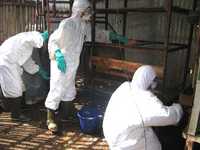 The Indonesian Red Cross volunteers sprayed the disinfectant (Virkon S) after cleaned the backyard farm. The Virkon S has chosen as disinfection during the program since independently proven inactivated Avian Flu virus strain H5N1. It is also friendly user for human, environment and animals.