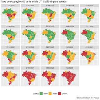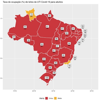 Currently there are 24 states and the Federal District, among the 27 federative units, with rates equal to or greater than 80%, with 19 of them exceeding 90%. The situation is absolutely critical. As in previous bulletins, we draw attention to the fact that the situation of the Covid-19 pandemic is very serious. One set of indicators, including the moving averages of cases and deaths and occupancy rates of Covid-19 ICU beds for adults, point to an extremely critical situation or even collapse, across the country.