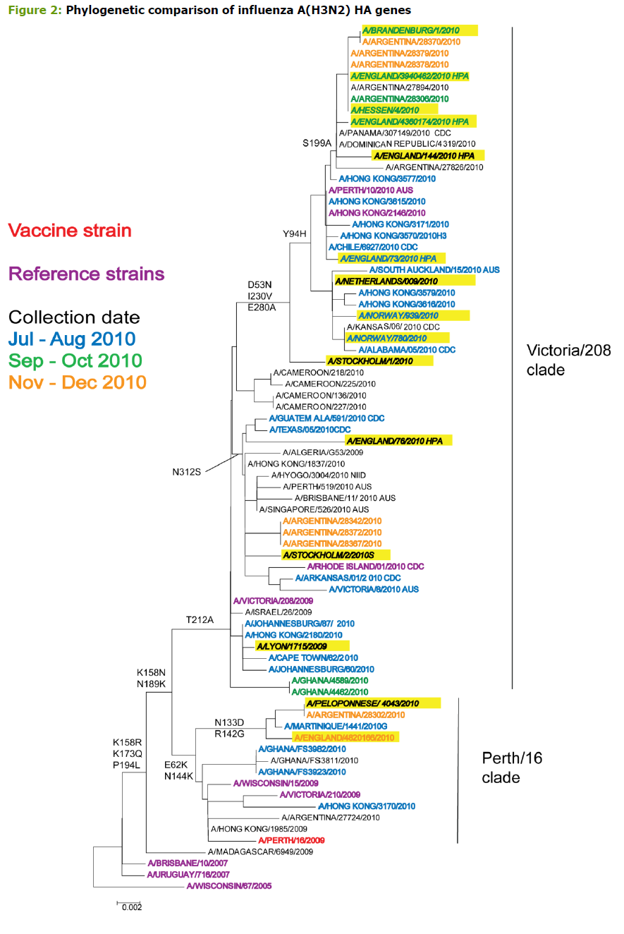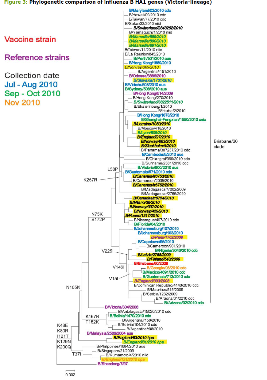 Based on the genetic characterization of 39 influenza viruses, 27 belonged to the pandemic A/California/7/2009 A(H1N1) clade; 3 belonged to the A(H3) clade represented by A/Perth/16/2009; 4 belonged to the A(H3) clade represented by the A/Victoria/208/2009 - A/Hong Kong/2121/2010 subgroup; 4 belonged to the B/Bangladesh/3333/2007 clade (Yamagata) lineage; and 1 to the B/Florida/4/2006 clade (Yamagata) lineage.