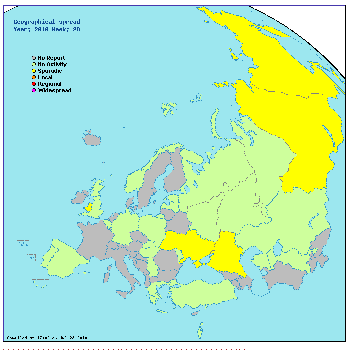 Sporadic influenza activity has been detected in Belarus, Russia (some regions), Ukraine, Armenia and Cyprus. For western Europe, only Wales report activity.