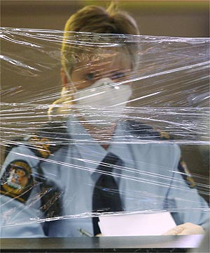 PRECAUTION: Customs officer Karen Hennessy views "passengers" from behind a makeshift sneeze guard during a flu-like pandemic exercise at Christchurch Airport yesterday.