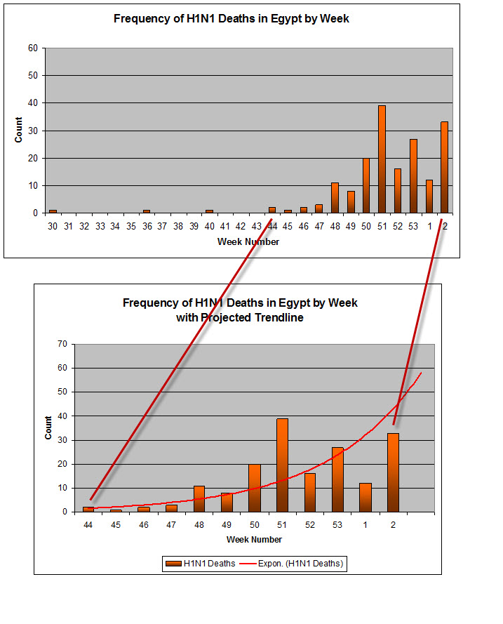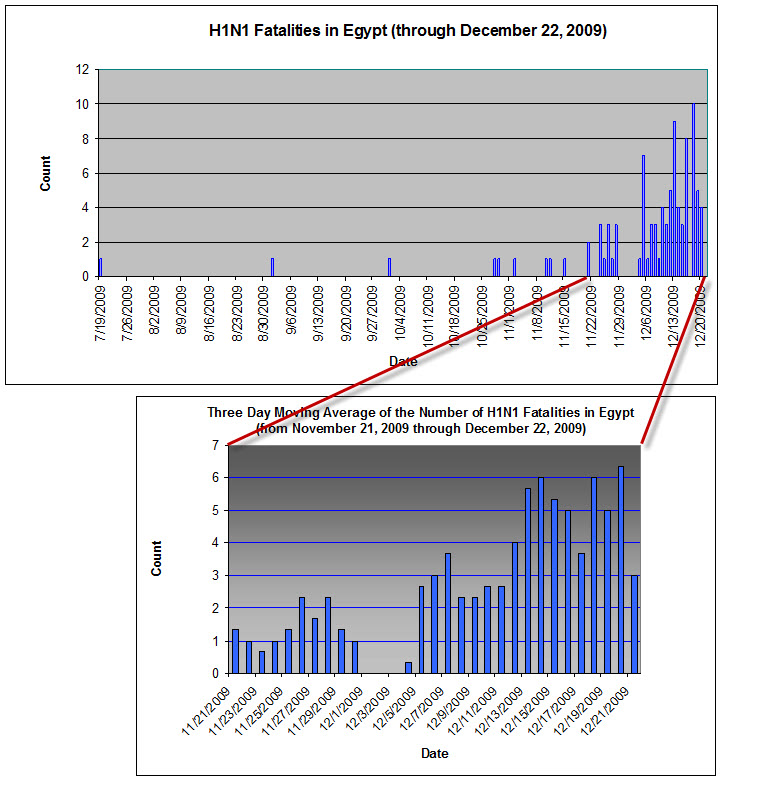 The first death from H1N1 in <st1:country-region w:st="on"><st1:place w:st="on">Egypt</st1:place></st1:country-region> was on July 19, 2009. Over the next four months, 8 additional H1N1 deaths were reported in <st1:country-region w:st="on"><st1:place w:st="on">Egypt</st1:place></st1:country-region>. About November 20, 2009 multiple H1N1 deaths started to be reported on a single day. Since then, the frequencies of H1N1 deaths has been increasing as shown in the charts below. The case count on the timeline presented below is generally based on the date of the news reports may not be precisely correct, but the trend is clear. The most obvious conclusion is that H1N1 fatalities in <st1:place w:st="on"><st1:country-region w:st="on">Egypt</st1:country-region></st1:place> have risen dramatically recently; there is no reason to suspect that a peak has been reached.