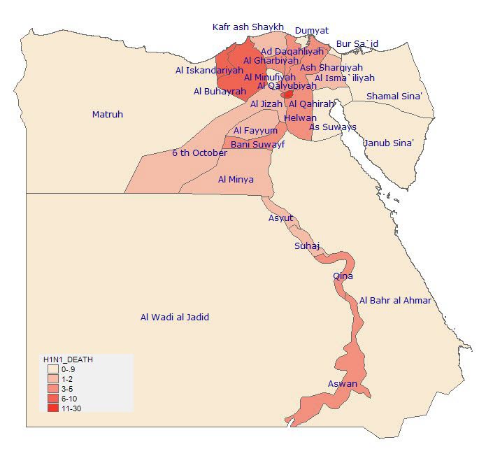Only about 86 of the 101 fatalities can be assigned to a governorate. <st1:city w:st="on"><st1:place w:st="on">Cairo</st1:place></st1:city> has the largest number of deaths with 27 to date. The most significant interpretation from this data is that H1N1 deaths are clustering in densely populated governorates.