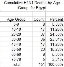 Post #1 above discusses 101 H1N1 deaths in <st1:country-region w:st="on"><st1:place w:st="on">Egypt</st1:place></st1:country-region> through December 23, 2009. During the past 15 days an additional 72 individuals have died in <st1:place w:st="on"><st1:country-region w:st="on">Egypt</st1:country-region></st1:place> (link). News releases from the Ministry of Health are no longer stating ?underlying conditions? and, noticeably, deaths of pregnant women are no longer identified, although a number of the women who died since December 23 are of child bearing age.