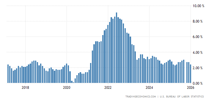 Inflation Rate in the United States decreased to 2.40 percent in January from 2.70 percent in December of 2025. This page provides - United States Inflation Rate - actual values, historical data, forecast, chart, statistics, economic calendar and news.