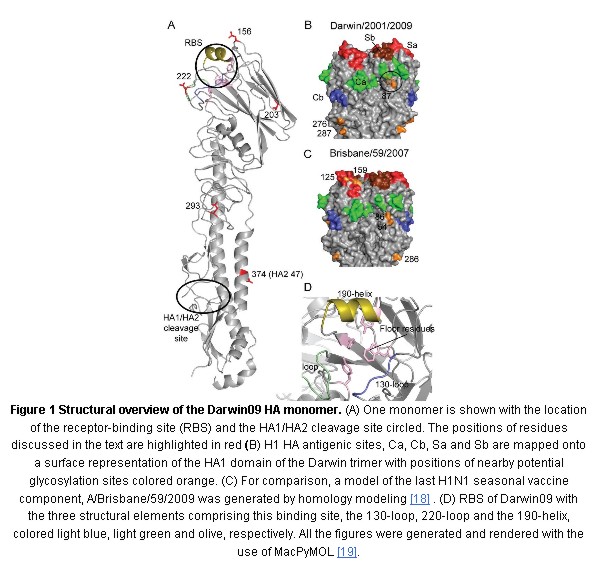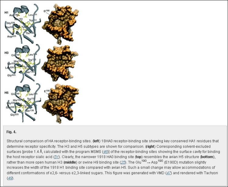 One more graphic from Structure of the Uncleaved Human H1 Hemagglutinin from the Extinct 1918 Influenza Virus which again shows the RBS with some AAs labeled inc. 153. As always beware differences in serotype numbering systems which cause some papers to talk about the same position as 222 and others call it 225, I have not been clear in this post as it relates to an area not a critical SNP and is not critical to the principals involved.Click image for larger version