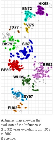 If you look at the plot of H3N2’s HI tests over time from its emergence in 1968, taken from another of my posts in this work shop Hemagglutination Inhibition assays and antigenic mapping. It should make it easier to visualise. The linked post does have further links to H1N1(2009) antigenic maps but as it has not had very long in which to accumulate mutations and branch out, phylogenically, they still form a fairly tight grouping and are consequently not as useful as this rather elegant map of H3N2's erratic meander. Each square is a two fold dilution in an HI test, each little circle is a HI test, each colour denotes the area covered by a different vaccine, the TX77 is the groups representative sequence, in this case Texas 1977.