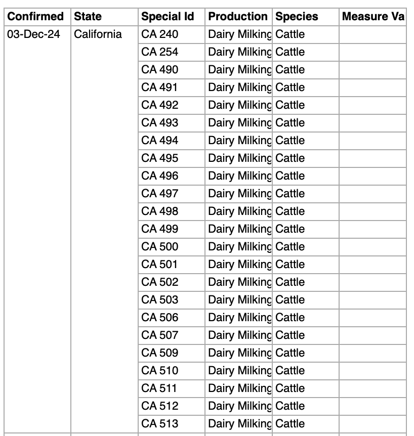 Really the number is a range now because of the overlap in reporting between the state and USDA. For instance, so odd...in post #92 above, the USDA has a herd with the number 028 dated Nov. 21. What? The sequence numerically is now in low 500s. Where has this #028 been since Sept.?