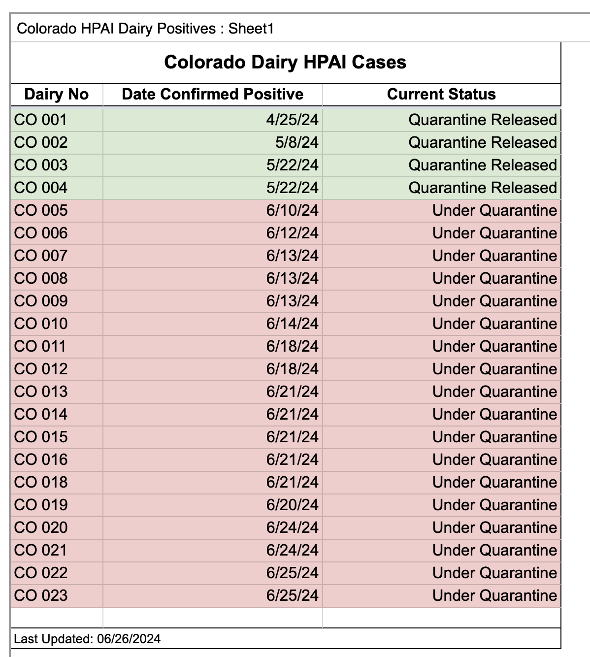 | CO 001 | 4/25/24 | Quarantine Released |