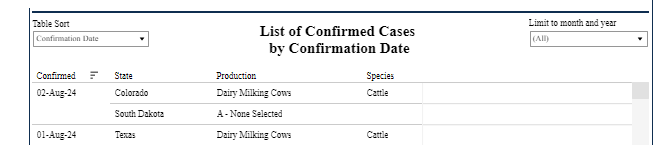 58 affected herds: ... State Species Date confirmed by NVSL Michigan Dairy Milking Cattle 5/22/2024 Michigan Dairy Milking Cattle 5/22/2024 Michigan Dairy Milking Cattle 5/22/2024 Michigan Dairy Milking Cattle 5/22/2024 Idaho