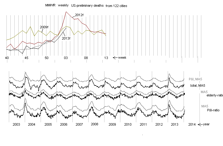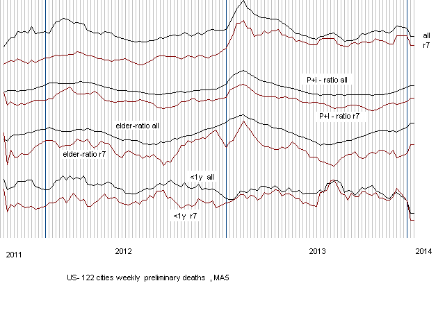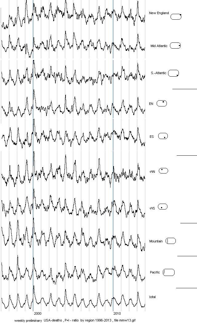 why so many more deaths in 2013 than 2012 in region 5 (West-South-Central) in almost each week ?