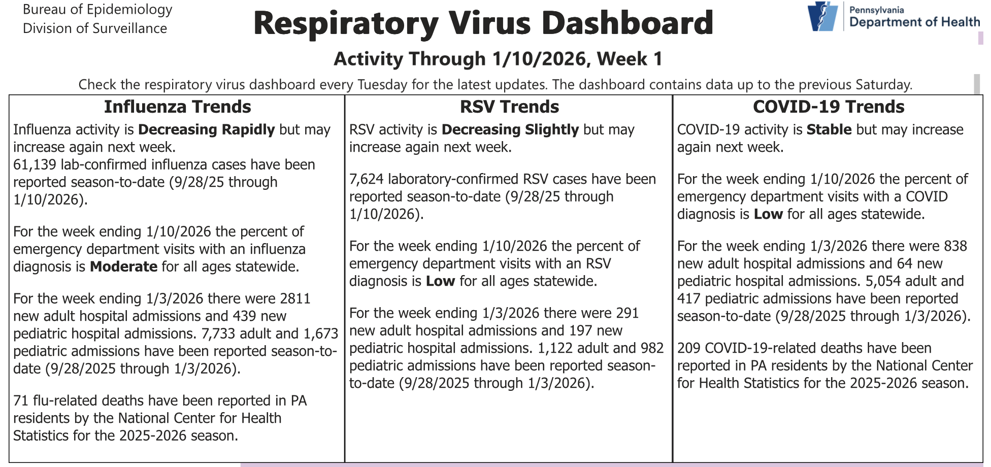 The Pennsylvania Department of Health provides weekly updates throughout the respiratory virus season on its respiratory virus dashboard to keep residents informed.
