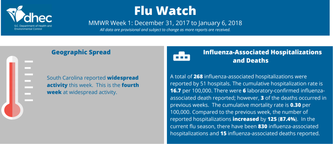 This flu season, a total of 151 influenza-associated deaths reported by DHEC, which said that South Carolina reported widespread activity this week. This is the 10th consecutive week at widespread activity.