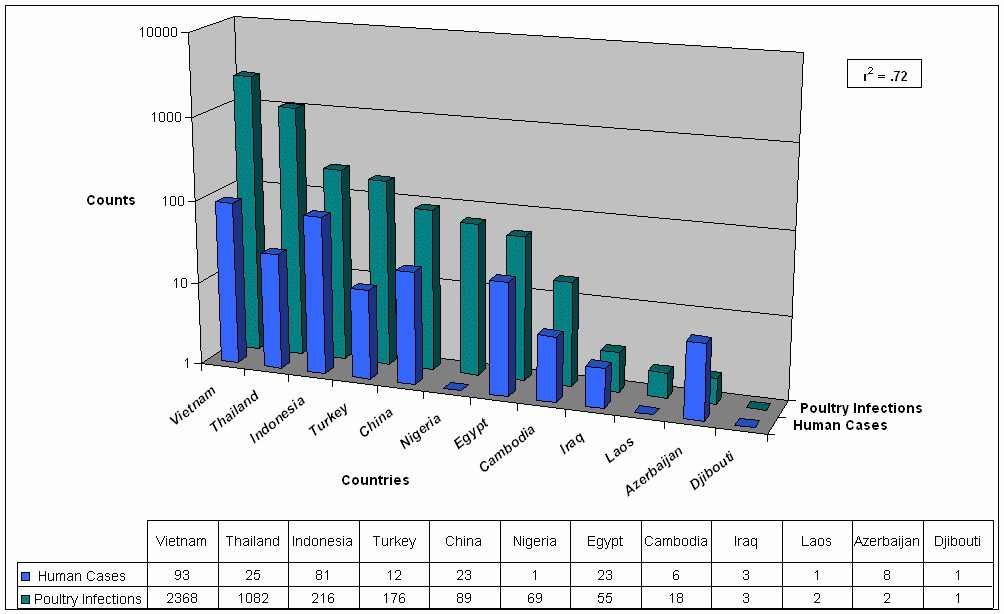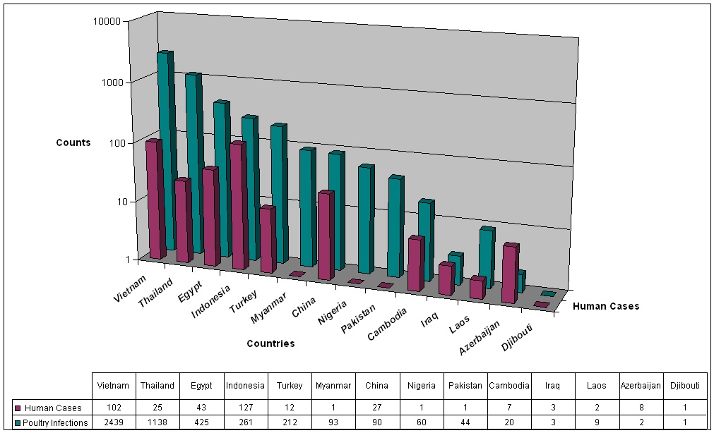 This was exactly the question I was trying to raise in my "H5N1 Puzzle". What is the possibility of getting a chart like the WHO yearly charts by country, but showing both human and avian events? Is there an onset of avian activity prior to the rise in human cases? Do the human cases then decline when the avian cases decline?