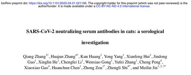 On April 3, local time, the research team of the State Key Laboratory of Agricultural Microbiology at Huazhong Agricultural University and the Wuhan Institute of Virology, Chinese Academy of Sciences jointly published a new study on the preprint platform bioRxiv, "SARS-CoV-2 neutralizing serum antibodies in cats: a serological investigation ".